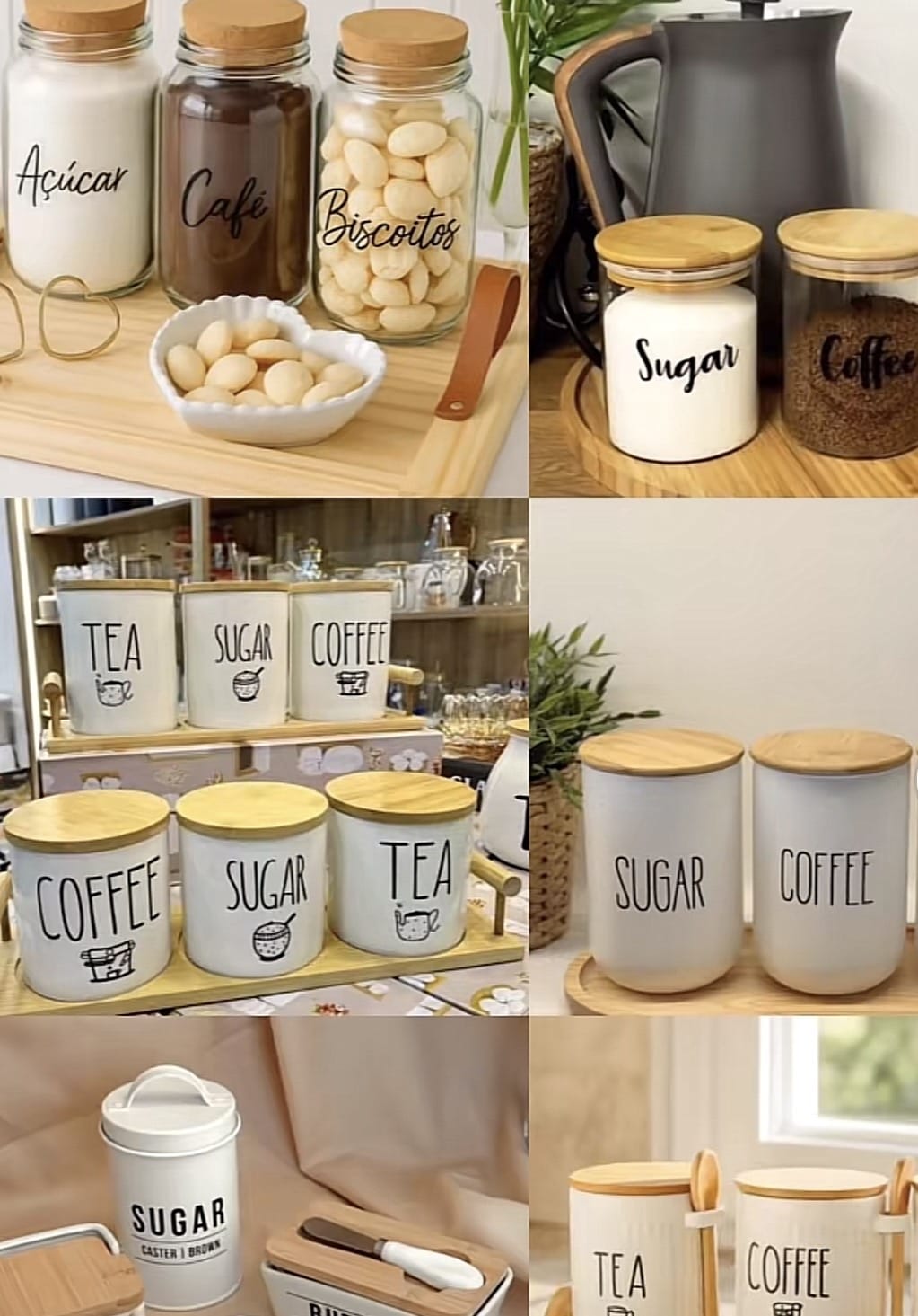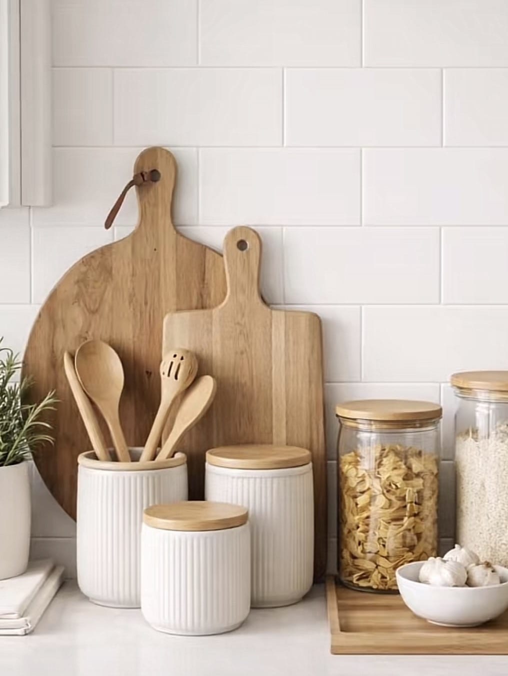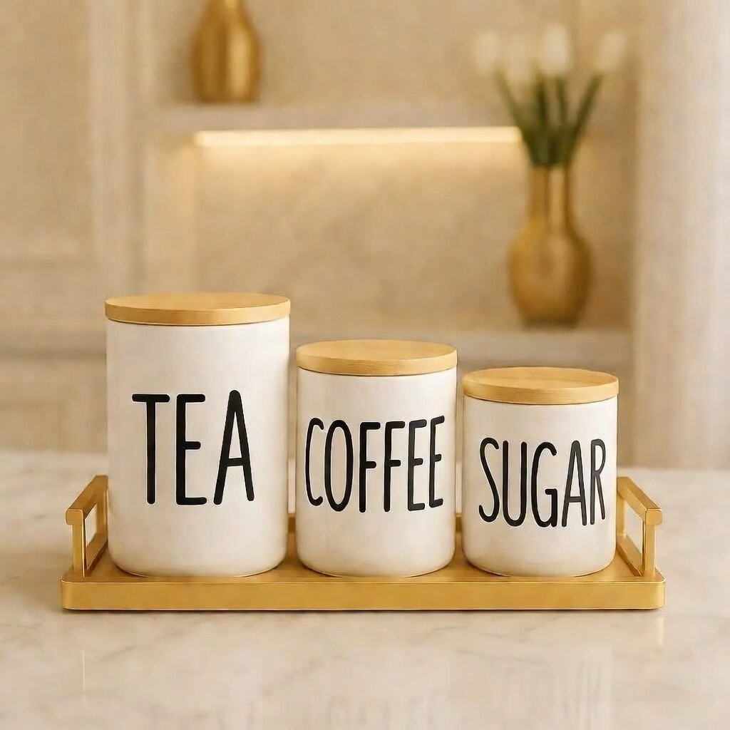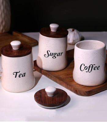 Ceramic Tea Coffee Sugar Containers Set of 3 with Wooden Lids